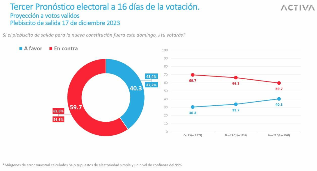 El sondeo que presenta su tercer pronóstico electoral para este proceso, revela que la opción «En Contra» se impondría por una diferencia de 19,4 puntos porcentuales sobre el «A Favor».