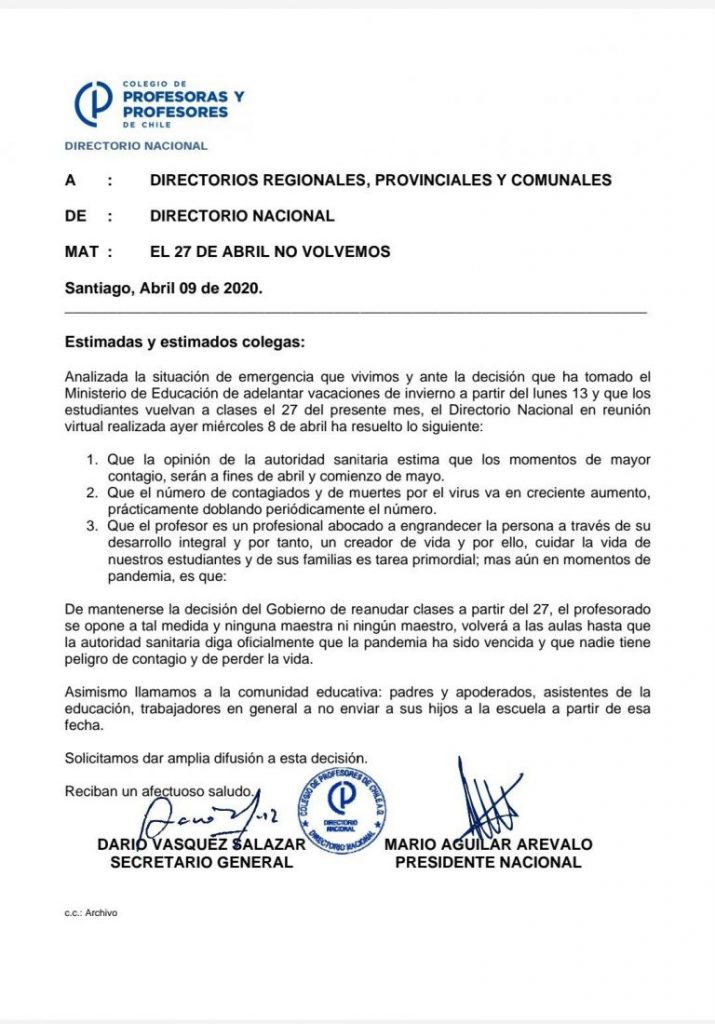 El rechazo al anuncio de las autoridades fue realizado a través de un comunicado publicado en varios medios y plataformas digitales. Allí, el Colegio de Profesores señala que «de mantenerse la decisión del Gobierno de renaudar las clases el 27 de abril, el profesorado se opone a tal medida y ninguna maestra ni ningún maestro, volverá a las aulas hasta que la autoridad sanitaria diga oficialmente que la pandemia ha sido vencida y que nadie tiene peligro de contagio y de perder la vida».
