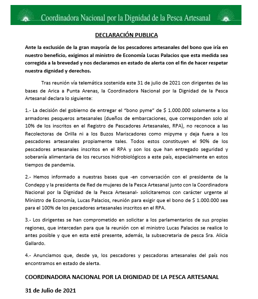 A través de una declaración pública, denunciaron que la decisión del gobierno de entregar el “bono pyme” de $ 1.000.000 solamente a los armadores pesqueros artesanales (dueños de embarcaciones, que corresponden solo al 10% de los inscritos en el Registro de Pescadores Artesanales, RPA), no reconoce a las Recolectoras de Orilla ni a los Buzos Mariscadores como mipyme y deja fuera a los pescadores artesanales propiamente tales.