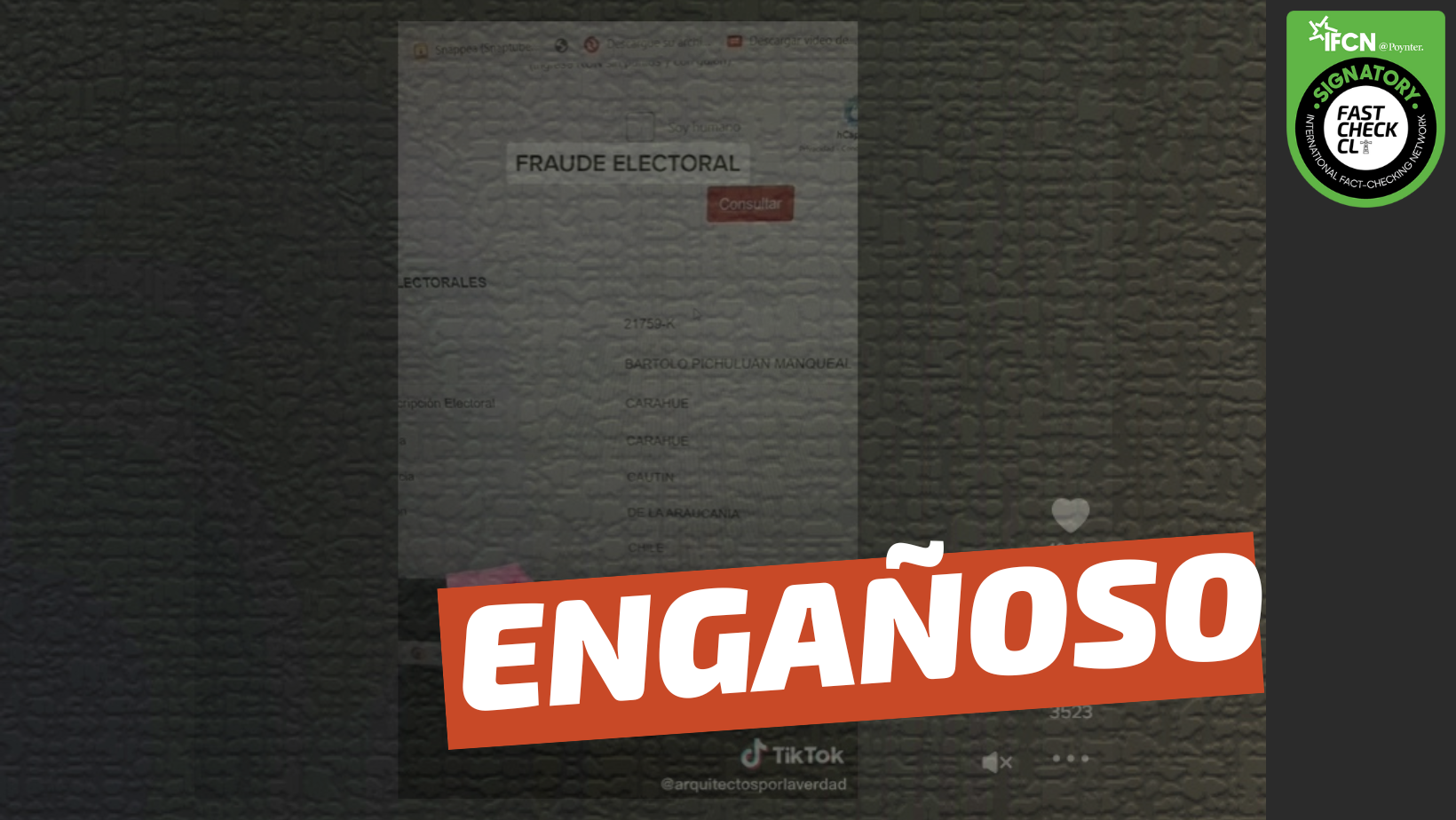 - Se ha viralizado en redes sociales un video que afirma que se avecina un fraude electoral para el Plebiscito del 4 de septiembre, dado que hay personas fallecidas que aparecen en el padrón. Tal es el caso de un fallecido que aparece habilitado para sufragar en La Araucanía, pero lleva 69 años difunto.