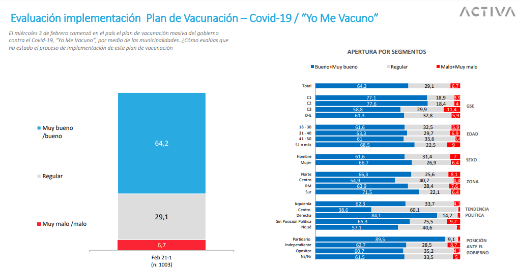 “Los datos muestran que la gente está bastante conforme con el plan de vacunación, hay que entender también que esto fue una luz de esperanza en lo que estamos viviendo. La forma en que se comunica (el plan) también está muy bien evaluada”, recalcó León.