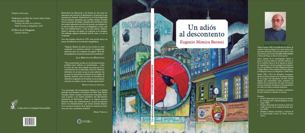 El escritor magallánico (y, por supuesto, meridianista) Eugenio Mimica Barassi, reedita Un adiós al descontento (Ediciones Universidad de Magallanes; 2021, 130 páginas), cuya primera edición (Mosquito Editores, 1991) pasó casi desapercibida. Se puede decir que después de La amortajada de María Luisa Bombal, Casa de Campo de José Donoso, de 2666 de Roberto Bolaño o, ahora último, de las novelas y relatos –no sólo sobre el ya mítico Puerto Peregrino sino también con otros lugares y personajes como en el libro de relatos Paganas Patagonias– del también magallánico Oscar Barrientos Bradasic, hace mucho que en la narrativa chilena falta considerablemente esta unión entre el delirio, la capacidad fabuladora, el imaginario barroco y un lenguaje o estilo abierto hacia la multiplicidad (el estilo es el lenguaje) y con un idioma, como en este caso, coloquial y no por eso menos creativo. Sabemos que la escritura de ficciones siempre tiene al acecho la tentación del realismo más lineal (en el estilo de a true story) o si nos salimos de este, tenemos como única posibilidad el género de la llamada ciencia-ficción, sobre todo en Chile, donde parece estar prohibido salirse de la tradición del criollismo, de la novela social, del costumbrismo, de la novela experimental demasiado cercana, claro está, a los cánones cortazarianos, y cayendo, incluso, en una especie de reivindicación de un topos que, muchas veces, forma parte de un estereotipo de lo chileno o de lo latinoamericano. A pesar de los ya nombrados o a pesar de Juan Emar, de Manuel Astica, de Carlos Droguett, de Mercedes Valdivieso, de Marta Brunet o del Enrique Lihn novelista. Claro que sí, la literatura de un Nicomedes Guzmán, de un Manuel Rojas, de un Francisco Coloane, y –entre los fundadores de la chilena literatura– de una Rosario Orrego o de un Blest Gana, nos muestran una variada y poderosa tradición narrativa que, de algún modo, escribe lo que somos. Y son imprescindibles. Pero, hay que decirlo, la crítica literaria se ha ido anquilosando en su mayor parte en una especie de personalismo a la Alone o en un acrítico tributo a la academia que asfixia todo atisbo que enriquezca la escritura nacional o la renueve, si se quiere así. Por eso no es inexplicable que la aparición de esta novela, en 1991, no haya sido saludada como se merecía.