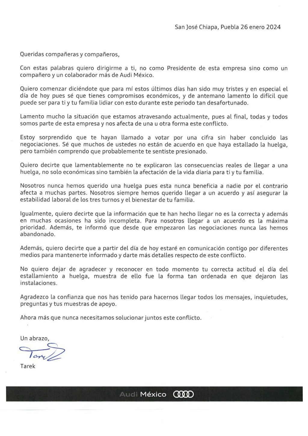 Ese mismo 26 de enero, el representante legal de Audi México, Oscar de la Vega, envió un oficio dirigido al asesor legal de Sitaudi, Arturo Blázquez, para iniciar nuevamente las negociaciones sobre el aumento de sueldos.