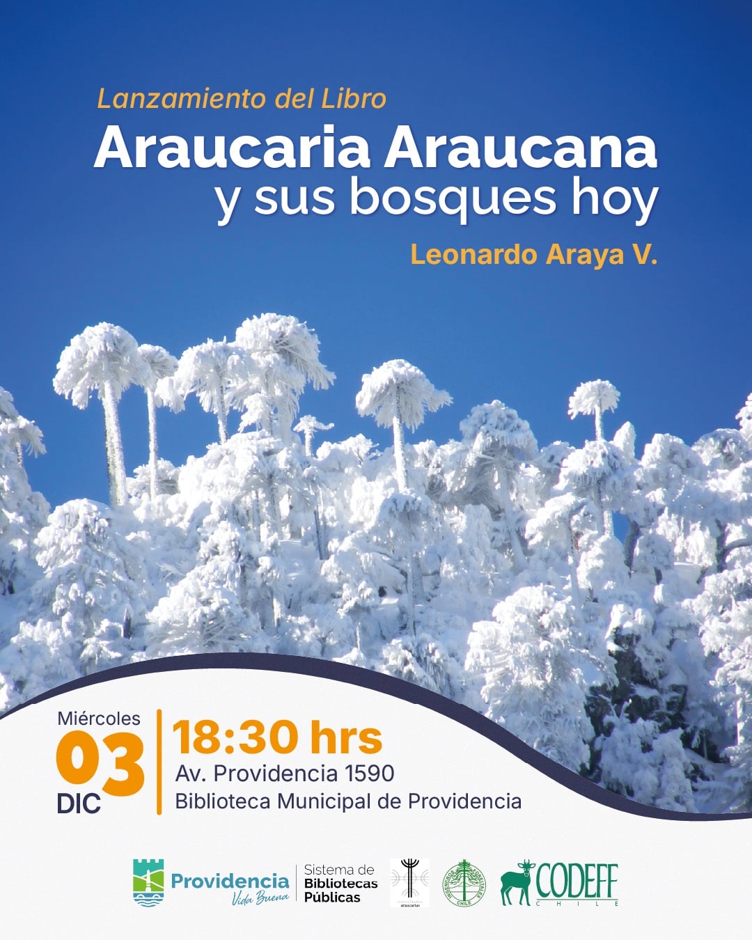 El lanzamiento es abierto a todo público y contará con la presencia del autor y representantes de las instituciones patrocinadoras: el Comité Nacional Pro Defensa de la Fauna y Flora (CODEFF), el Colegio de Ingenieros Forestales y la Reserva de la Biosfera Araucarias. El libro se podrá consultar en el Sistema de Bibliotecas de Providencia, entre otros puntos de lectura, y solicitar a través de su página web araucariaaraucana.cl
