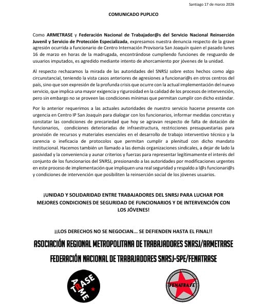 La madrugada del lunes 16 de marzo, un funcionario del Centro de Internación Provisoria (CIP) San Joaquín sufrió una grave agresión cuando un grupo de jóvenes lo emboscaron después de ir al baño. Uno de los internos intentó ahorcarlo con una «llave de brazo» mientras otro lo atacaba con cordones de zapatos, en un episodio que el gremio de la Asociación Regional Metropolitana de Trabajadores de Sename (ARMETRASE) califica como una situación de extrema gravedad para la integridad del personal.