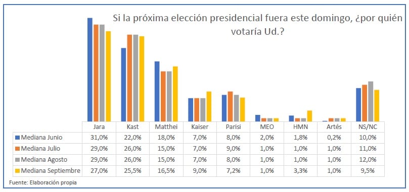 El estudio, que excluyó la encuesta CADEM por “errores sistemáticos” que inflaban los resultados de Kast y Kaiser, se elaboró con datos de Criteria, Datainfluyes, Panel Ciudadano y Pulso Ciudadano, generando medianas más “acordes con la realidad”. En esta metodología, Jara bajó de 31% en junio a 27% en septiembre, mientras Kast descendió de 26% a 25,5% y Matthei subió de 15% a 16,5%.
