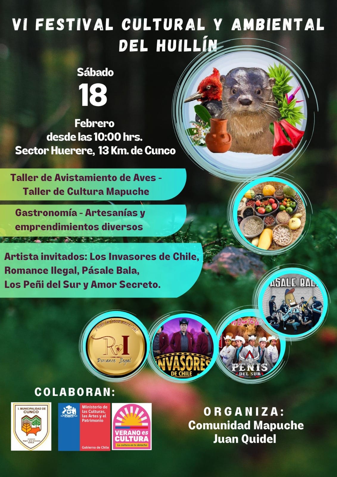 El 6° Festival Medio Ambiental Del Huillin en el sector Huerere (Werrere), comuna de Cunco, Región de la Araucanía, se realizará durante todo el día sábado 18 de febrero de este 2022, iniciativa impulsada por familias de la comunidad mapuche Juan Quidel.