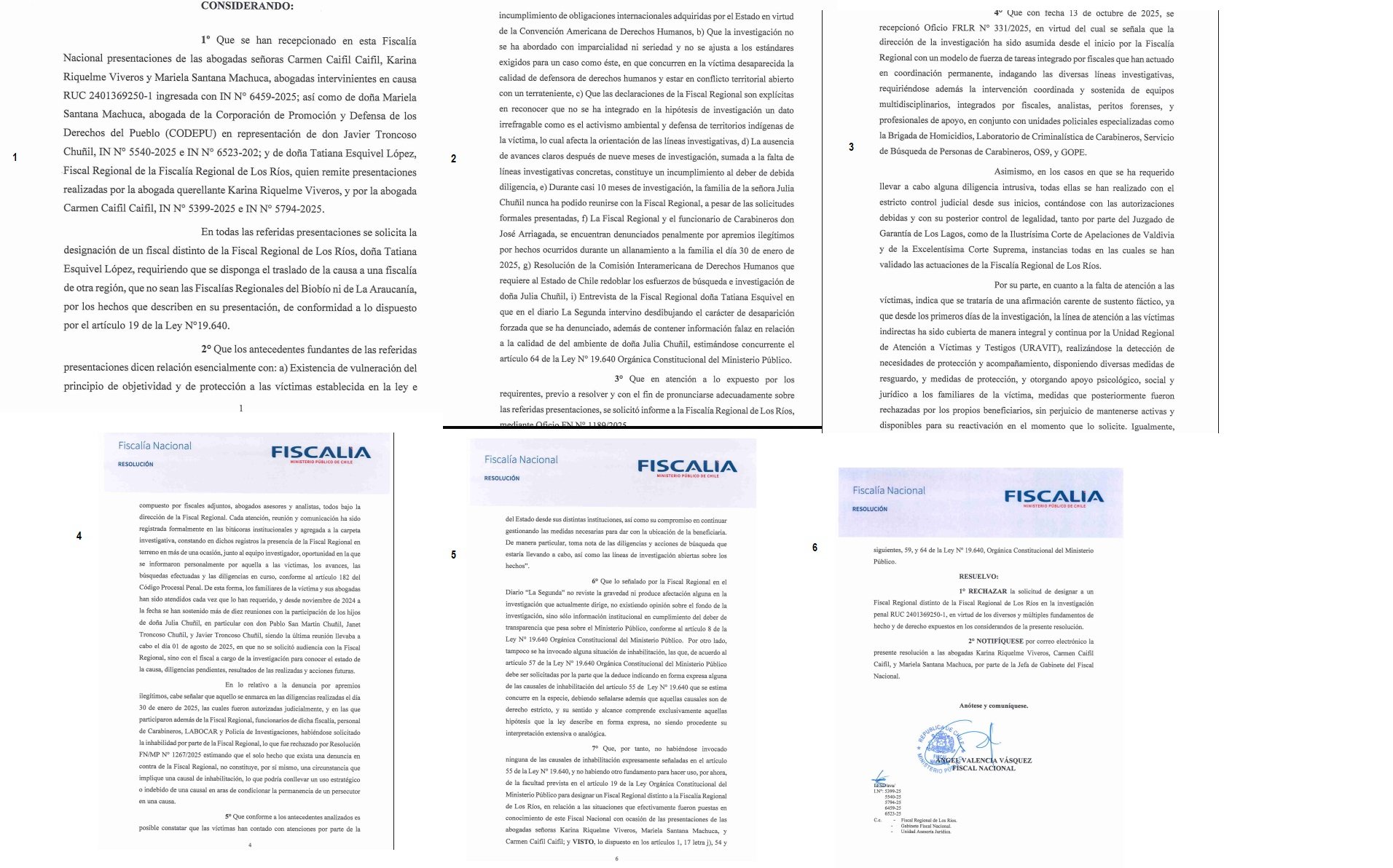 Resolución del Fiscal Nacional rechazando solicitud de abogadas caso Julia Chuñil de un nuevo fiscal en el caso