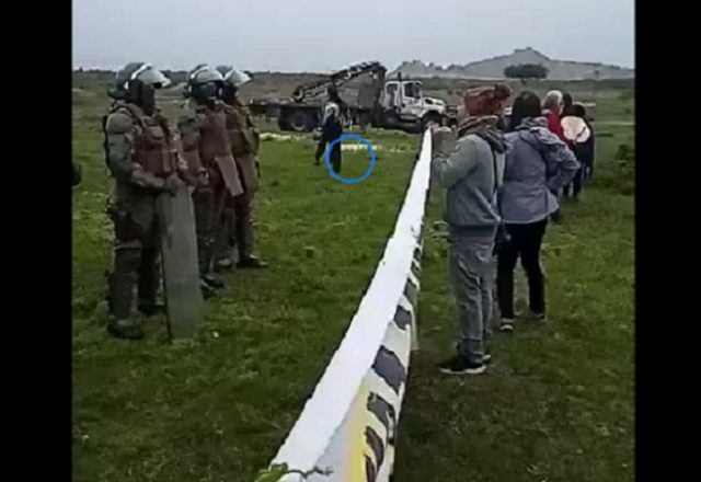 La empresa inmobiliaria llegó acompañada de un amplio contingente policial, generándose la detención de tres personas defensoras del territorio.