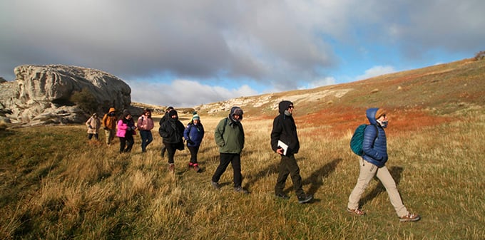 “Huellas Atávicas” se centró en explorar las primeras manifestaciones culturales del territorio magallánico, un espacio habitado hace miles de años. El programa incluyó talleres de arte, charlas especializadas y, lo que marcó la experiencia, numerosas salidas a terreno para apreciar el Arte Rupestre de la Patagonia.