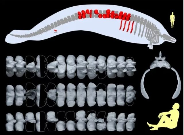 Cada una de sus vértebras tiene un peso de 150 kilogramos. Con base en esta medida y el uso de escáneres láser para crear modelos del resto de huesos, el equipo presume que el esqueleto completo del Perucetus pesa más del doble que el de una ballena azul, pese a estar un poco más grande.