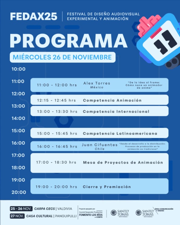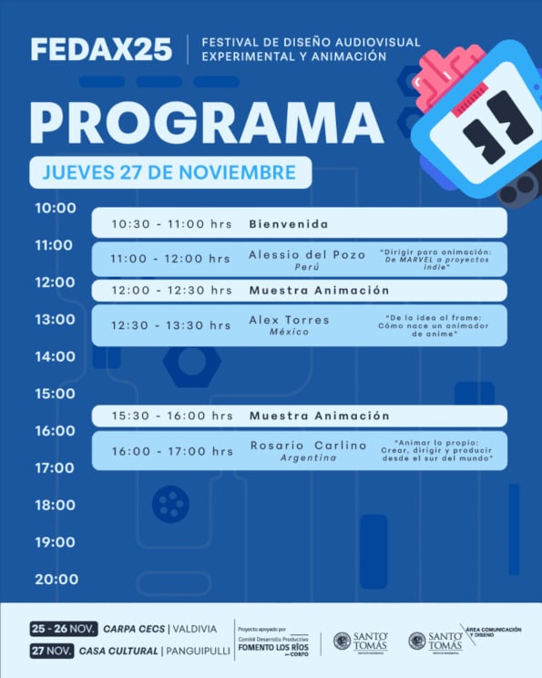 FEDAX25 se realizará el 25 y 26 de noviembre en la Carpa Cecs de Valdivia, y el 27 de noviembre en la Casona Cultural de Panguipulli, extendiendo así su programación nacional e internacional.