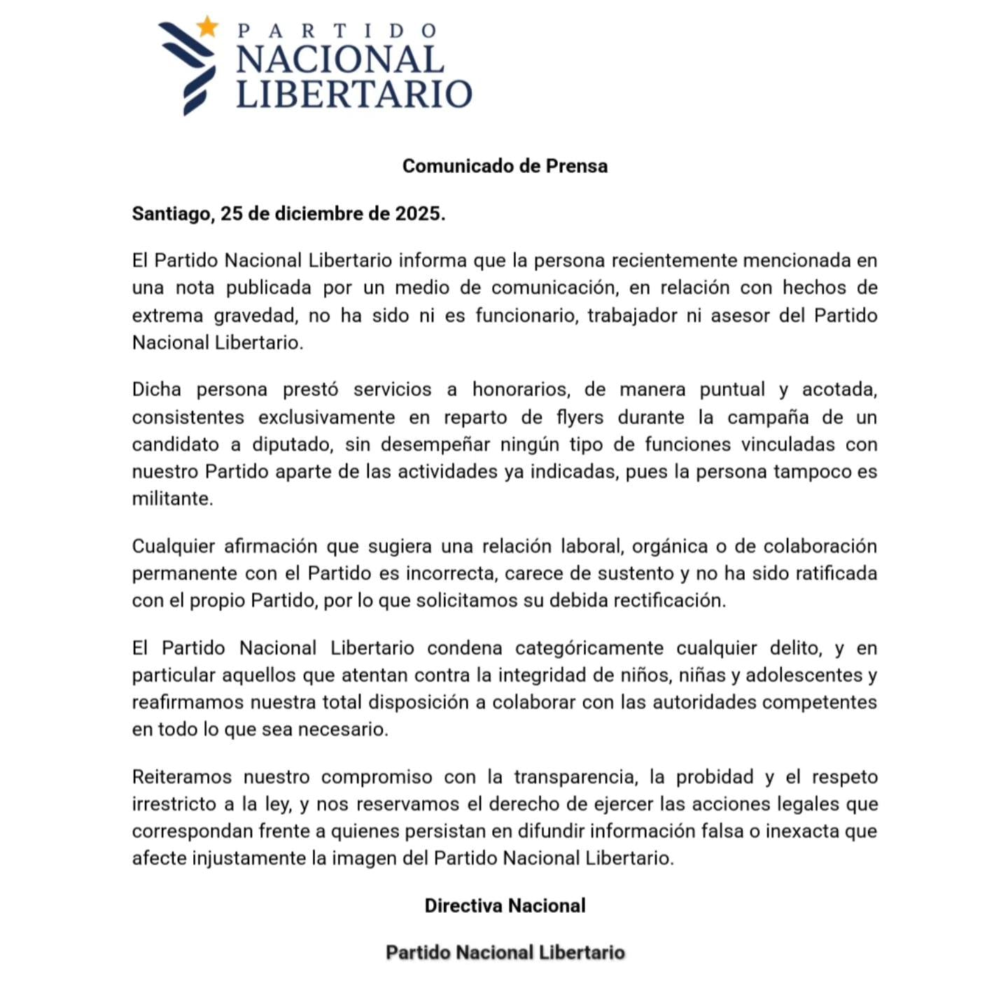 Frente a la creciente polémica, el Partido Nacional Libertario emitió un comunicado oficial fechado el 25 de diciembre de 2025, en el que se desmarca del imputado. En la declaración, el PNL señala que Morales Iter “no ha sido ni es funcionario, trabajador ni asesor” del partido, precisando que solo prestó servicios a honorarios, de manera puntual y acotada, consistentes exclusivamente en el reparto de flyers durante una campaña parlamentaria.