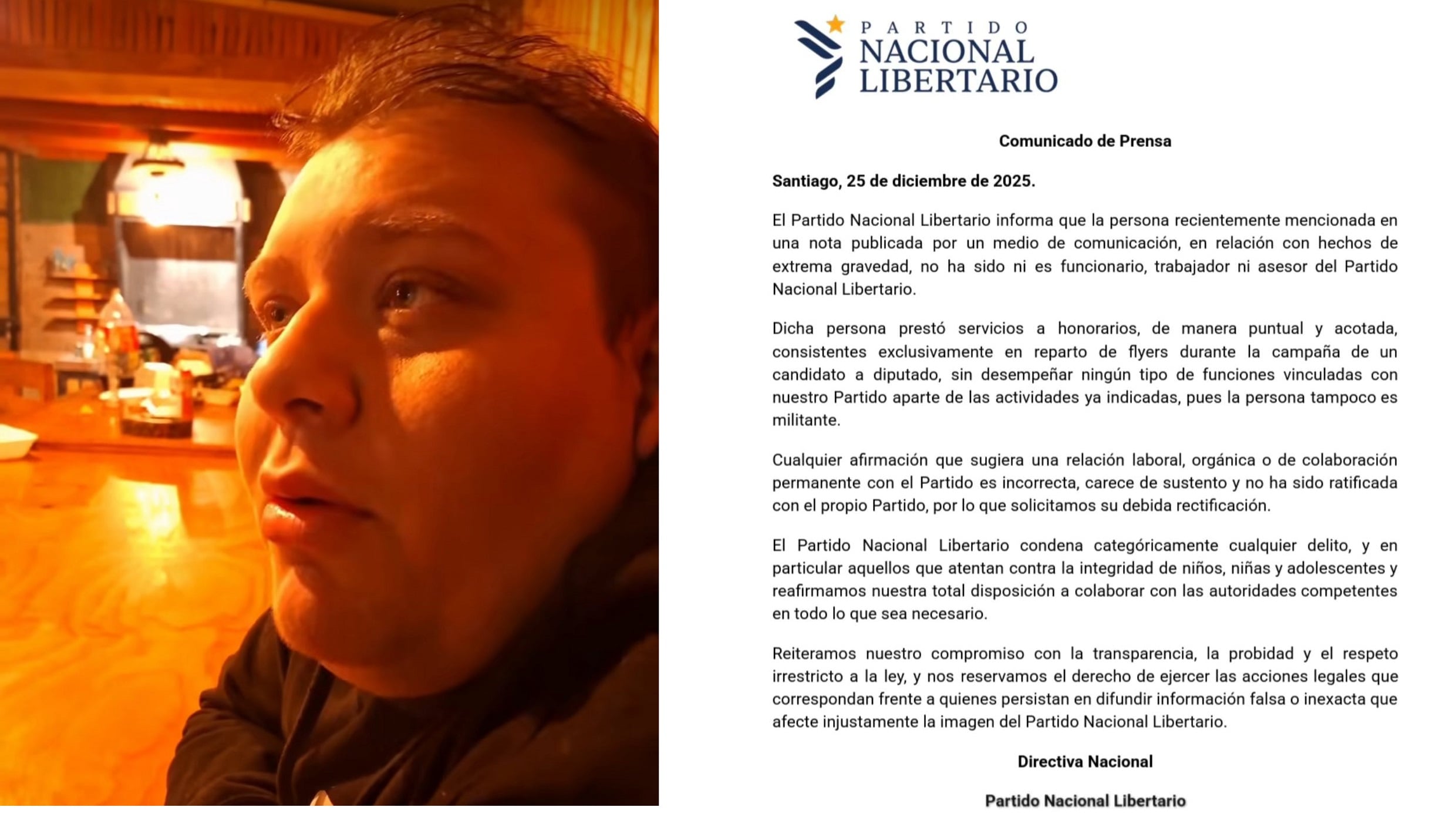 El partido agregó que cualquier afirmación que sugiera una relación orgánica o laboral permanente “es incorrecta, carece de sustento y no ha sido ratificada” por la colectividad, solicitando su rectificación. Asimismo, condenó categóricamente los delitos imputados, en especial aquellos que afectan a niños, niñas y adolescentes, y manifestó su disposición a colaborar con las autoridades competentes, reservándose además acciones legales ante la difusión de información falsa.
