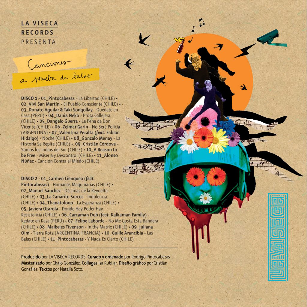 El pasado 1 de mayo, Día de les Trabajadores, el sello La Viseca Records, lanzó al mundo, Canciones a prueba de balas, disco compilatorio que reúne a 21 músicos de Chile, Perú y Argentina, un ramillete hermoso de canciones con sentido y razón, hermanadas por la médula temática de lo que comenzó con la revuelta popular -el 18 de octubre del 2019- y que hoy se agudiza día a día con la pandemia.