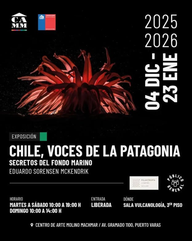 El Centro de Arte Molino Machmar (CAMM) en Puerto Varas – región de Los Lagos – se convierte en el escenario de una impactante expedición visual. Hasta el próximo 23 de enero de 2026, el público podrá visitar la exposición fotográfica “Chile, voces de la Patagonia: Secretos del fondo marino”, del destacado fotógrafo Eduardo Sorensen.