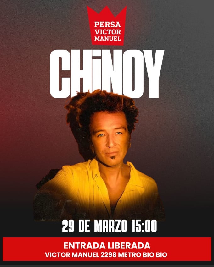 Este domingo 29 de marzo, a las 15:00 horas, el destacado músico y cantautor nacional Chinoy ofrecerá un concierto gratuito en la Plaza Central del Persa Víctor Manuel (a pasos de Metro Bío Bío línea 6, Barrio Franklin).