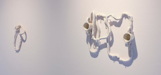 Uno de los ejes centrales de la exhibición es el uso del ombligo como molde escultórico. La artista utiliza su propio cuerpo para dar forma a la arcilla, creando registros materiales que funcionan como testigos de un origen compartido. A esta serie se suman objetos cotidianos de la infancia y réplicas de manos en cerámica que se retuercen en formas imposibles, reforzadas por cordones y nudos que simbolizan la unión umbilical y la resistencia de los vínculos afectivos.