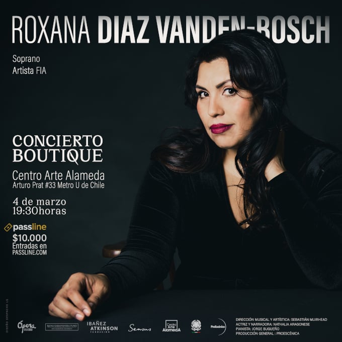 Roxana Diaz Vanden-Bosch es cantante FIA (Fundación Ibáñez Atkinson) y una de las sopranos dramáticas chilenas con mayor proyección internacional, desarrollando su carrera en prestigiosos escenarios de Europa como el Teatro Regio di Parma, el Festival dei Due Mondi, el Teatro Pavarotti-Freni de Módena, el Palau de les Arts de Valencia, entre otros, interpretando roles emblemáticos del repertorio operístico.