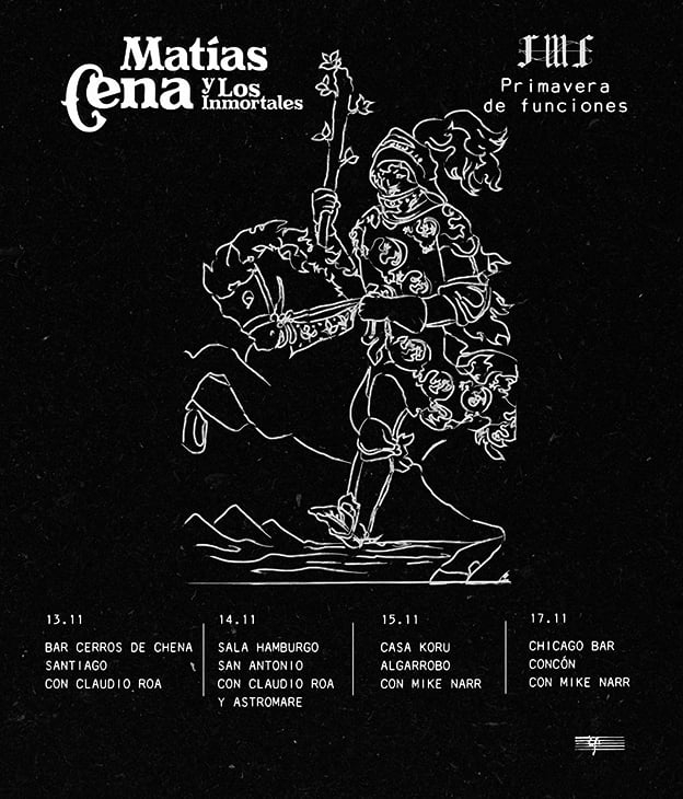 Luego de su regreso acústico en sala SCD, el cantautor Matías Cena vuelve a la carretera en una primavera de funciones por la Quinta Costa y Santiago, acompañado de Los Inmortales, cuarteto de músicos históricos. La ruta que lo llevará por Santiago, San Antonio, Algarrobo y Concón, se presenta como una oportunidad única para escuchar viejos clásicos y uno que otro nuevo hit.