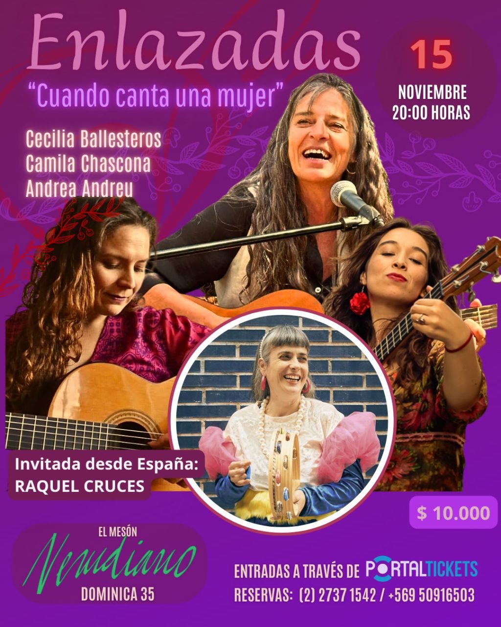 «Enlazadas», se realizará el sábado 15 de noviembre, a las 20:00 horas, en El Mesón Nerudiano, ubicado en calle Dominica 35, Recoleta. Las entradas están a la venta a través de PortalTickets.