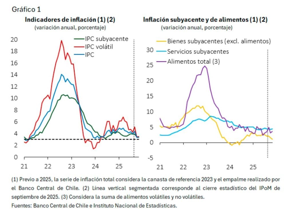 Según el Informe de Política Monetaria (IPoM) de diciembre de 2025, la inflación total ha bajado más rápido de lo proyectado en septiembre, tanto en el indicador general como en el subyacente. En noviembre, la variación anual del IPC total y del IPC sin volátiles fue de 3,4%, por debajo de los valores cercanos a 4,0% que se observaban en agosto.