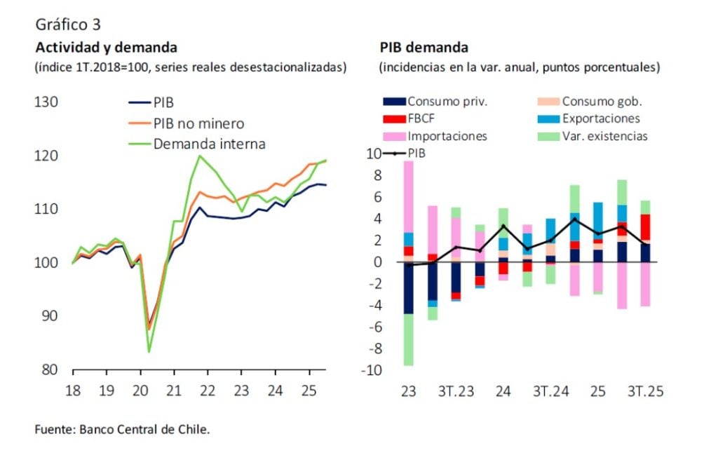 En contraste con la narrativa de crisis permanente, el Banco Central afirma que, en general, la actividad local ha estado en línea con lo previsto, con una inversión más dinámica, especialmente en maquinaria y equipos. En el tercer trimestre, el PIB no minero creció en línea con las proyecciones: descontada la estacionalidad, aumentó 0,4% trimestral (2,6% anual, serie original), destacando el desempeño de los servicios y, en menor medida, del comercio.