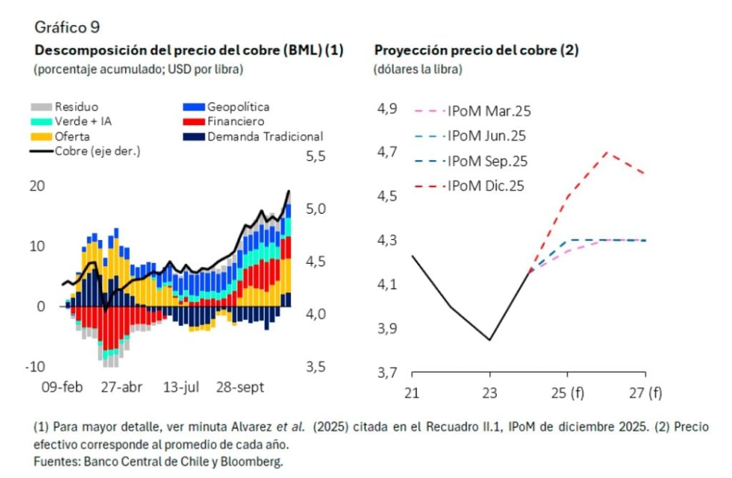En este contexto, el Banco Central revisa al alza el crecimiento previsto de los socios comerciales, desde 2,6 a 2,8% en promedio para 2025-2026, y actualiza sus proyecciones de precios de materias primas: el precio promedio del cobre se estima ahora en US$4,7 en 2026 y US$4,6 en 2027, por encima de los US$4,3 considerados antes. Esto contribuye a un menor déficit de cuenta corriente proyectado.