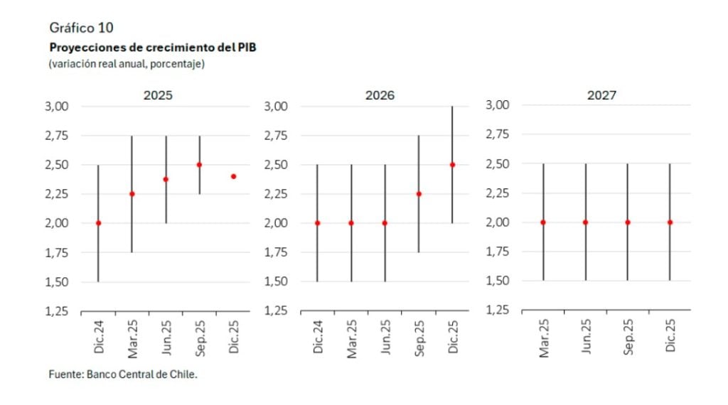 Con todo, el escenario central del Banco Central es algo más favorable que en el IPoM previo. Para 2025, se estima que el PIB crecerá 2,4%, en la parte media del rango proyectado en septiembre (2,25-2,75%). Para 2026, el rango se revisa al alza a 2,0-3,0% (desde 1,75-2,75% en septiembre), mientras que para 2027 se mantiene entre 1,5 y 2,5%, en línea con el crecimiento tendencial de la economía.