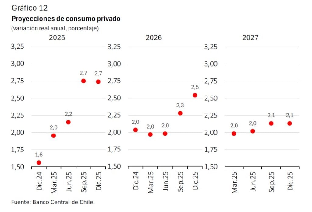 La inversión (FBCF) también mejora sus perspectivas: se proyecta un crecimiento de 7% en 2025 y 4,9% en 2026 (frente a 5,5 y 4,3% en septiembre), con 3,1% estimado para 2027. El Banco Central destaca que las condiciones financieras y las expectativas empresariales han mejorado, y que el impulso de la inversión se volvería más transversal entre sectores en los próximos años. El consumo privado se acercaría a tasas coherentes con el PIB de tendencia, con expansiones anuales cercanas a 2,5% en 2025 y 2026, y 2% en 2027, apoyado por la confianza de los consumidores y la masa salarial.