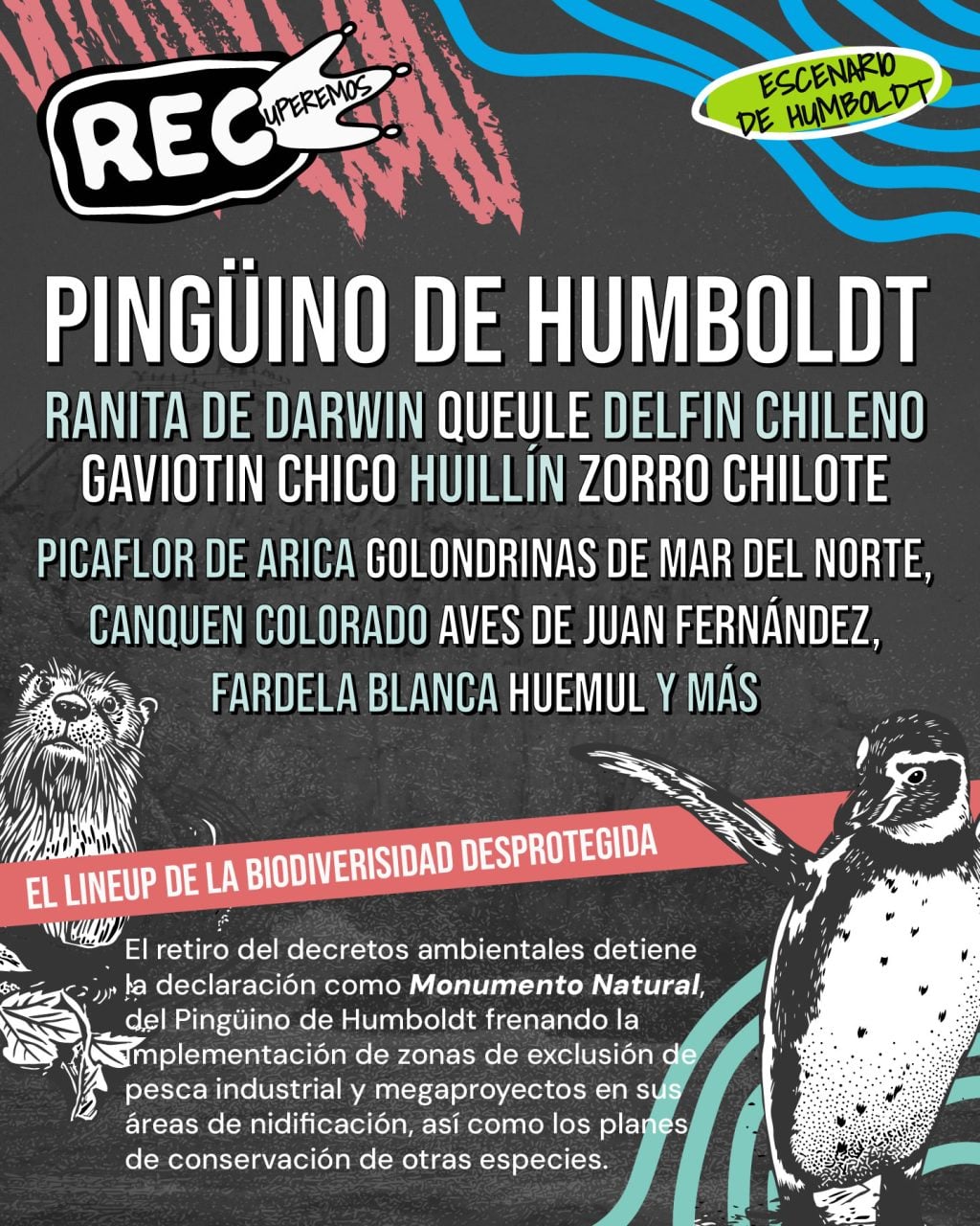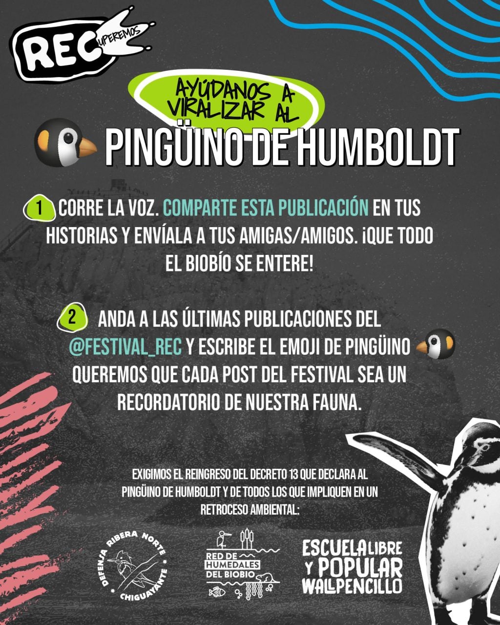 En el marco del Festival REC 2026, las agrupaciones socioambientales Defensa Ribera Norte, Escuela Libre y Popular Wallpencillo y la Red de Humedales del Biobío, junto a diversas ONG ambientales, lanzaron la campaña «RECuperemos al Pingüino de Humboldt».