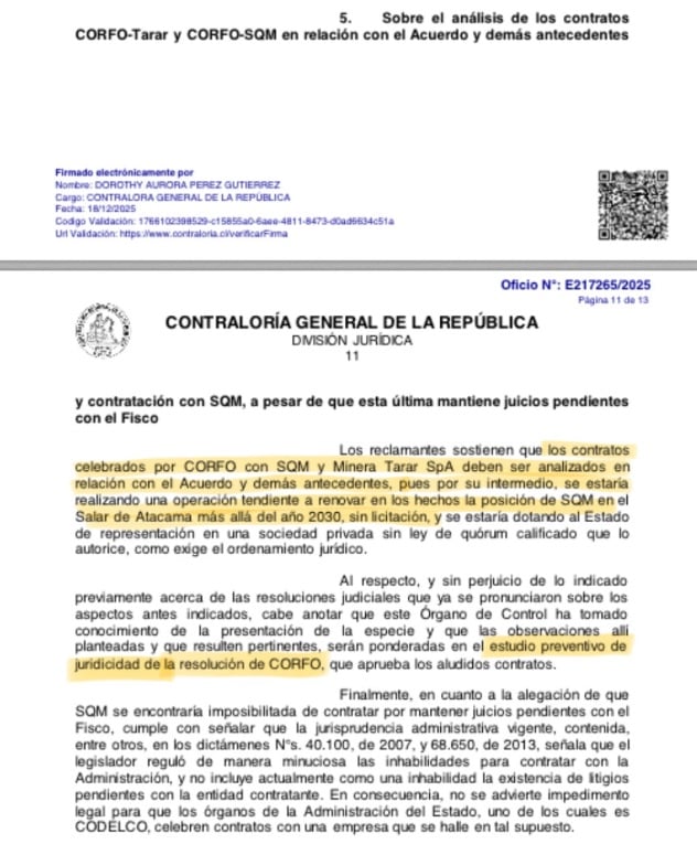 En ella da cuenta del vicio de origen entre Corfo y Codelco, para evitar una licitación sobre las pertenencias mineras propiedad de Corfo en el Salar de Atacama. Antecedentes que debiesen ser tomados en cuenta por la Contralora Dorothy Pérez.
