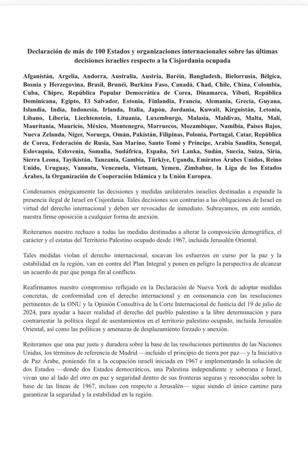 En el documento, los países y organizaciones firmantes condenan «enérgicamente las decisiones y medidas unilaterales israelíes destinadas a ampliar la presencia ilegal de Israel en Cisjordania».