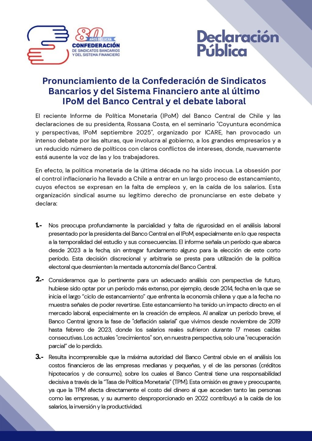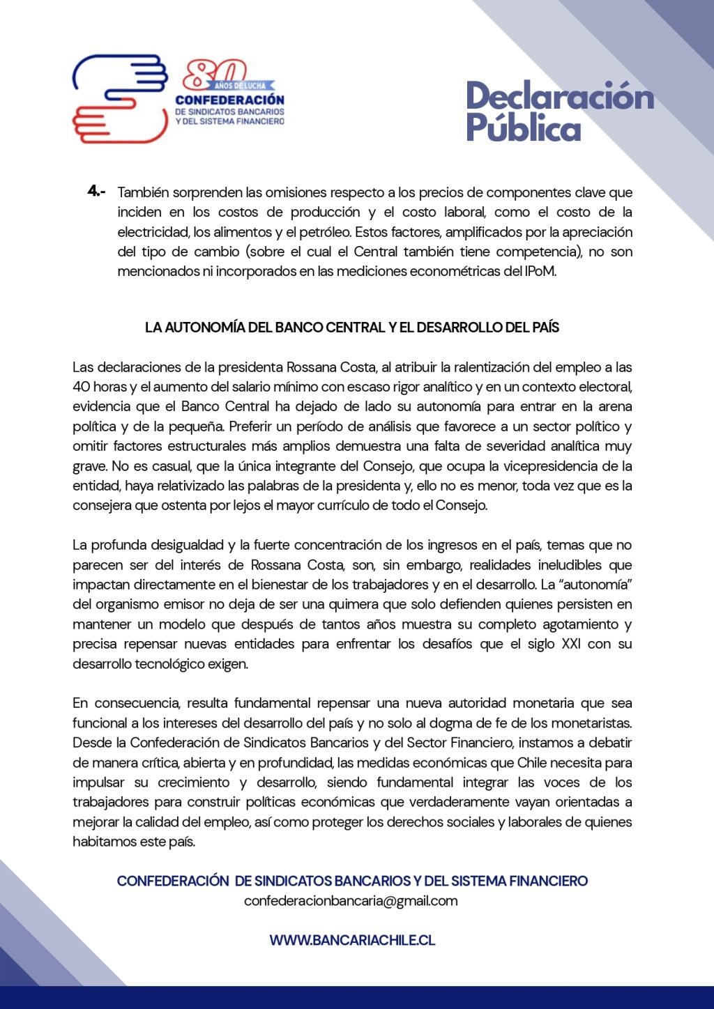 A través de una declaración pública, la Confederación de Sindicatos Bancarios y del Sistema Financiero cuestionó la autonomía del Banco Central a raíz de la reciente publicación de su Informe de Política Monetaria (IPoM) y las declaraciones de su presidenta, Rossana Costa, quien atribuyó la ralentización del empleo «a las 40 horas y al salario mínimo, con escaso rigor analítico y en un contexto electoral».