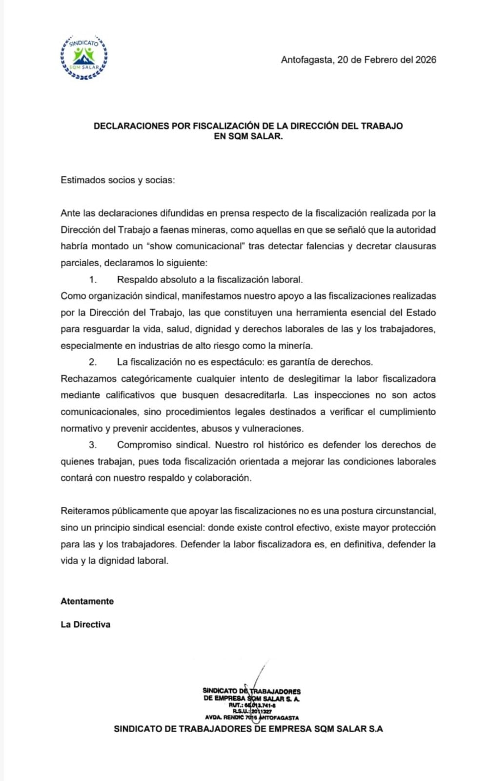 «Rechazamos categóricamente cualquier intento de deslegitimar la labor fiscalizadora mediante calificativos que busquen desacreditarla. Las inspecciones no son actos comunicacionales, sino procedimientos legales destinados a verificar el cumplimiento normativo y prevenir accidentes, abusos y vulneraciones», afirmaron desde el Sindicato de SQM Salar.