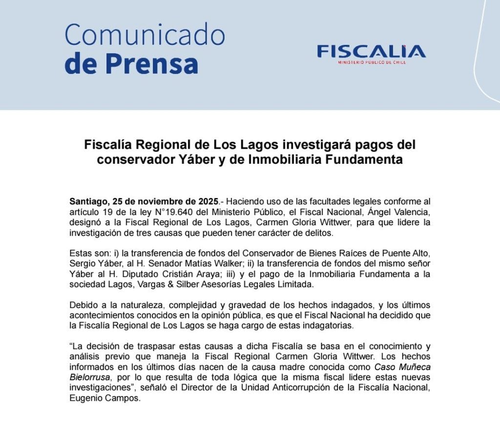 En específico, desde Fiscalía apuntan a tres causas judiciales: «La transferencia de fondos del Conservador de Bienes Raíces de Puente Alto, Sergio Yáber, al H. Senador Matías Walker; la transferencia de fondos del mismo señor Yáber al H. Diputado Cristián Araya; y el pago de la Inmobiliaria Fundamenta a la sociedad Lagos, Vargas & Silber Asesorías Legales Limitada», señalaron desde la entidad.