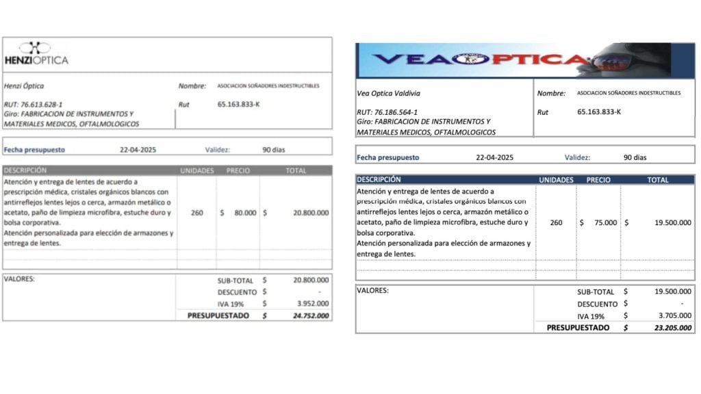 El caso más ilustrativo mencionado en los documentos corresponde al proyecto oftalmológico de la agrupación “Soñadoras Indestructibles”, que incluyó dos cotizaciones: una de “Vea Óptica” y otra de “Óptica Henzi” cuyos propietarios son las mismas personas.