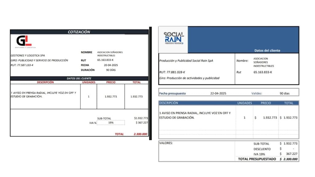 Otro elemento que agrava la denuncia ,y que podría ser también parte del eventual esquema defraudatorio, es que en las postulaciones al Fondo se adjuntaban cotizaciones de publicidad radial de dos empresas ambas por el mismo precio.
