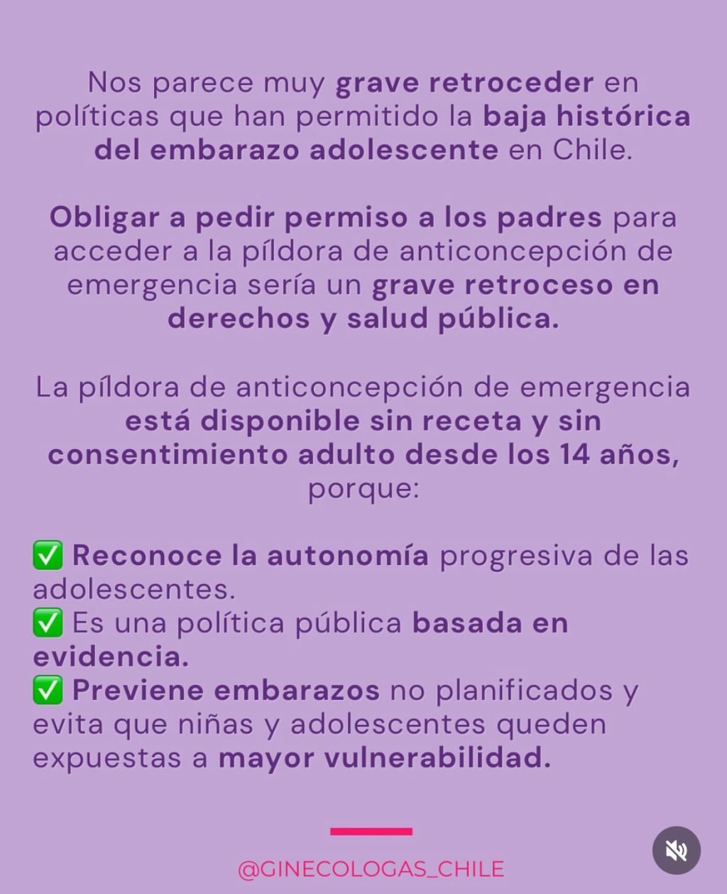 Al respecto, las profesionales recordaron que actualmente, «en Chile, las adolescentes desde los 14 años pueden acceder a la píldora de anticoncepción de emergencia sin receta y sin autorización de un adulto. Esta no es una medida antojadiza: es una política pública basada en evidencia científica y en el principio de autonomía progresiva, reconocido por la Convención de los Derechos del Niño».