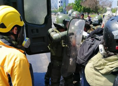 El INDH identificó a un niño que tiene alojadas balas en hígado, riñón y en sus piernas; a una niña herida con un balín en la pierna; a un hombre que recibió una lacrimógena en su rostro, y de seis personas con lesiones oculares. Estas constataciones fueron hechas en los hospitales Félix Bulnes, San Juan de Dios, Clínica Dávila, San Borja y Clínica Alemana. Hasta las 14 horas de este domingo 20 de octubre en regiones se registraban otras seis personas heridas.
