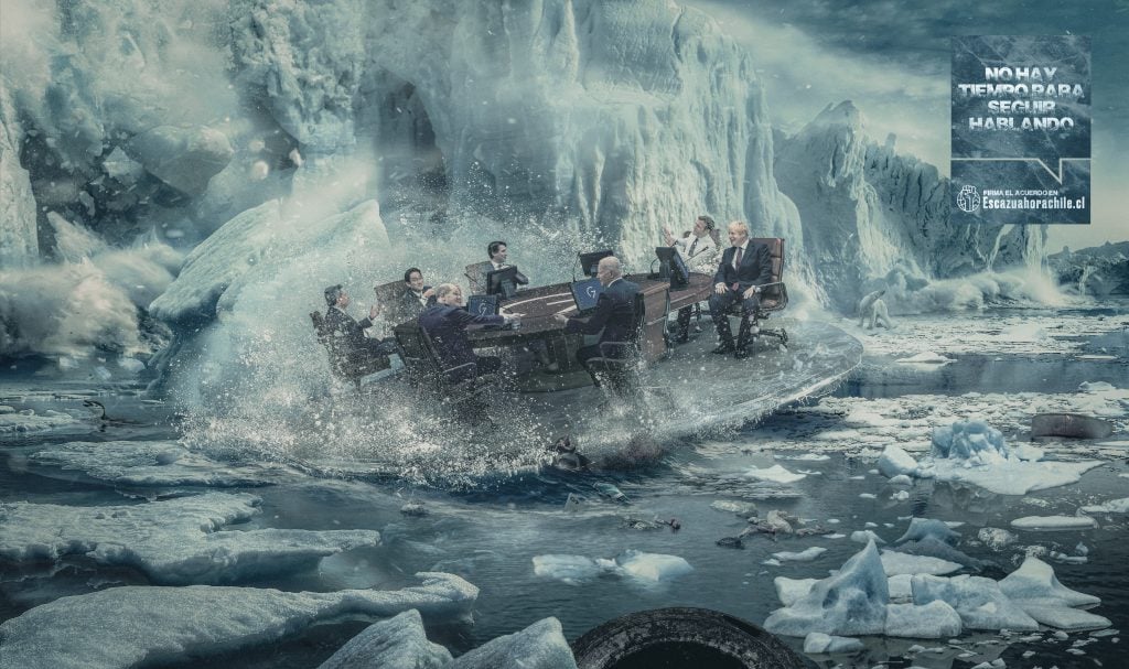 En este contexto, aparece la campaña gráfica «No hay tiempo para seguir hablando», la cual tiene como protagonista a los presidentes de los países que integran el G7, quienes en las imágenes siguen discutiendo cómo enfrentar la crisis, mientras la crisis ya está desatada y envolviéndolos a ellos mismos.