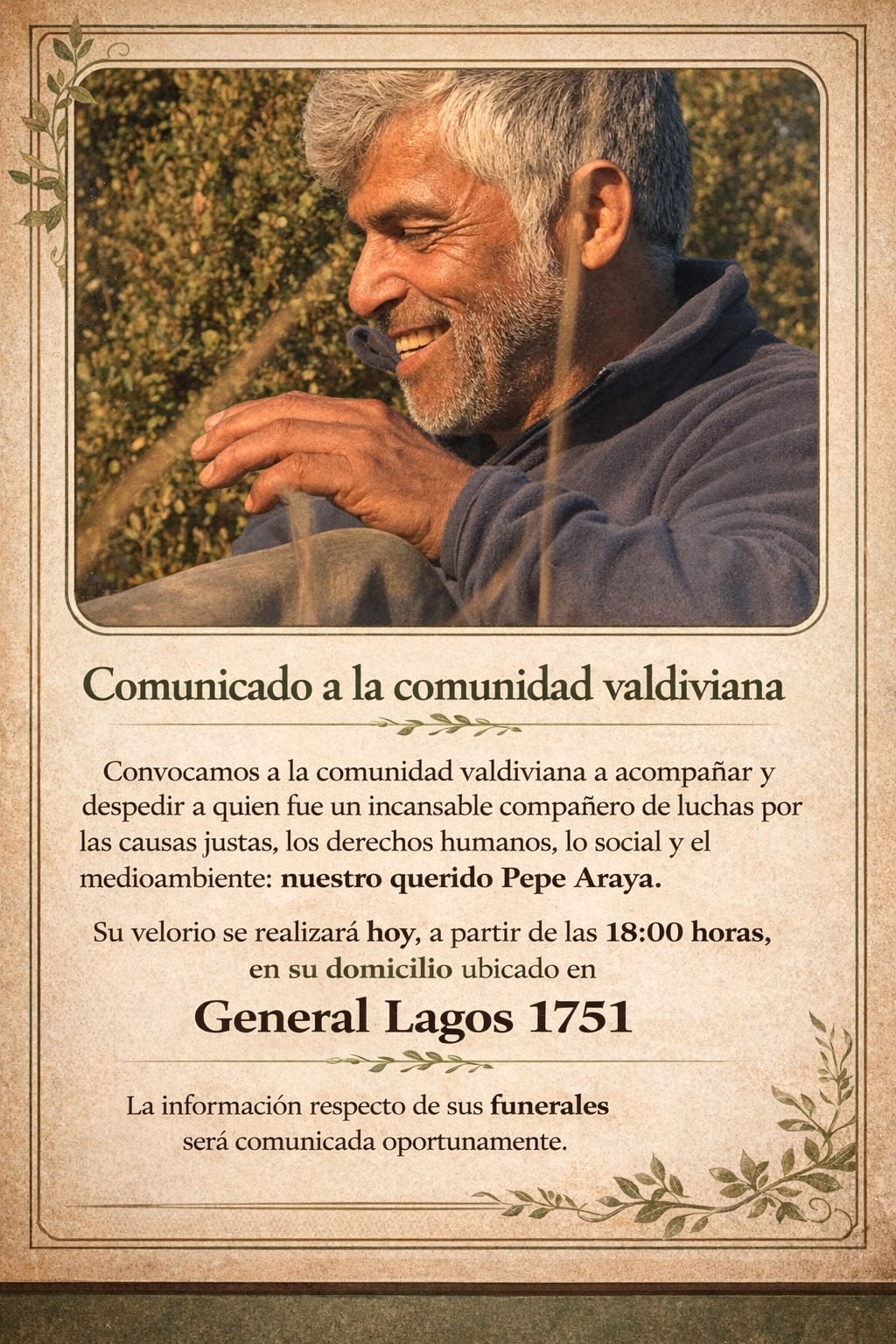 Valdivia despide a Pepe Araya, un nombre que para muchas y muchos no solo remite a una persona, sino a una forma de habitar el territorio: comprometida, organizada y profundamente ligada a las luchas socioambientales y de derechos humanos en la Región de Los Ríos.