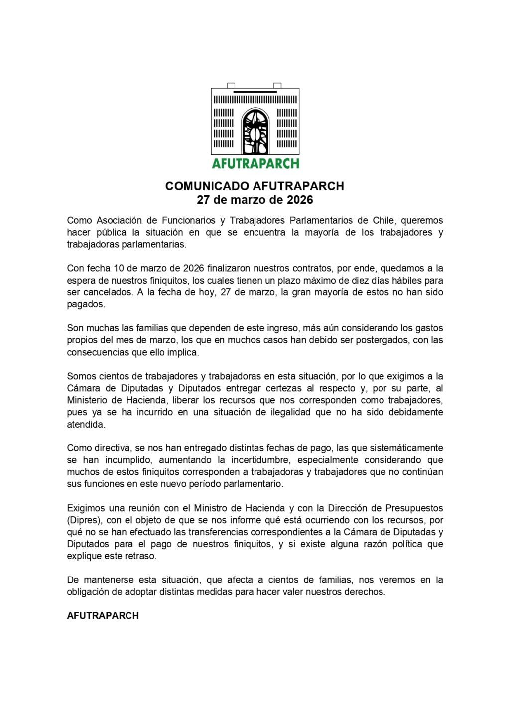 La Asociación de Funcionarios y Trabajadores Parlamentarios de Chile (Afutraparch) denunció una preocupante situación que les afecta, y que tiene que ver con el no pago de sus correspondientes finiquitos, a pesar de que el plazo legal para ello ya expiró.