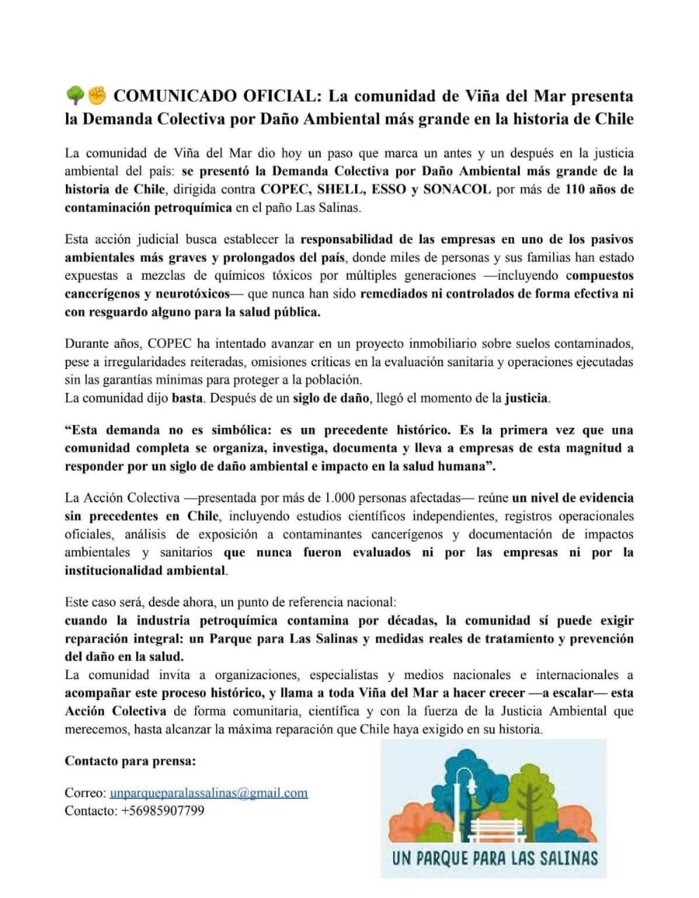 «Esta acción judicial busca establecer la responsabilidad de las empresas en uno de los pasivos ambientales más graves y prolongados del país, donde miles de personas y sus familias han estado expuestas a mezclas de químicos tóxicos por múltiples generaciones -incluyendo compuestos cancerígenos y neurotóxicos- que nunca han sido remediados ni controlados de forma efectiva ni con resguardo alguno para la salud pública», señala la declaración, firmada por el movimiento Un Parque para Las Salinas.