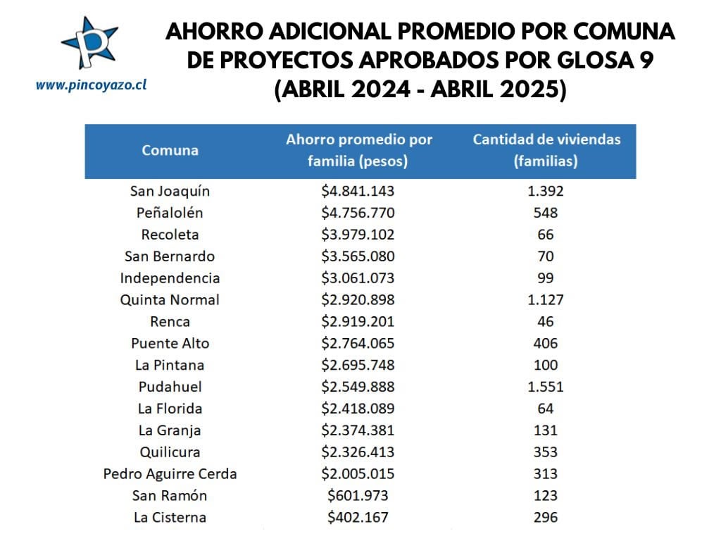 Ahorro adicional promedio por comuna de proyectos aprobados por el SERVIU RM vía Glosa 9 (2024-2025)