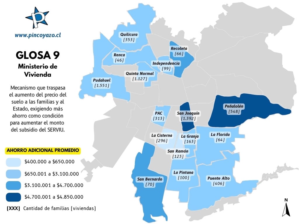 - Este aumento en el costo del terreno significa que los cerca de $47 millones que cuesta una vivienda social por la vía regular en promedio, con la actual glosa 9 su precio aumentó a $55 millones, y toda esa diferencia se va directo al bolsillo del dueño del terreno. Cabe aclarar que esta estimación mantiene los mismos costos de construcción real señalados en estos proyectos, y que estos cambian dependiendo de la comuna y región.
