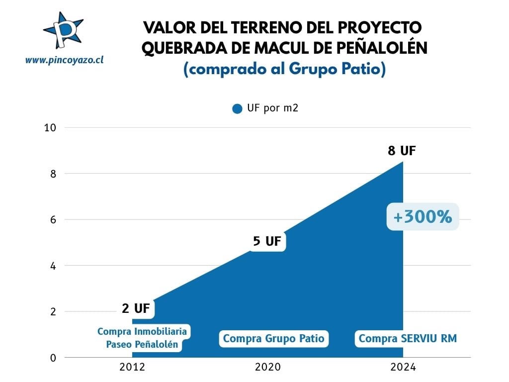 - En febrero de 2025, el SERVIU firmó una promesa de compra por 83.985 UF por las mismas 0,4 hectáreas (21 UF por m2, equivalente a $3.317 millones) para construir 139 viviendas. De esa forma, la empresa intermediaria se embolsó $2.966 millones por reservar el terreno durante 15 años.