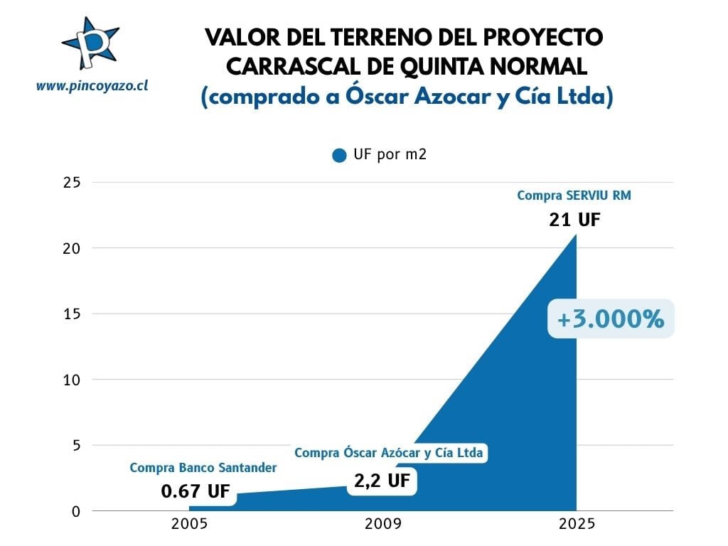 - Luego, en diciembre de 2009, Oscar Azócar y Compañía Limitada pagó al Banco Santander-Chile 8.890 UF por todos los terrenos (2,2 UF por m2, equivalente a $351 millones actuales), antes de fusionarse en el terreno actual. ¿El negocio? No producir nada, sino que solo esperar que la crisis habitacional se desarrolle.