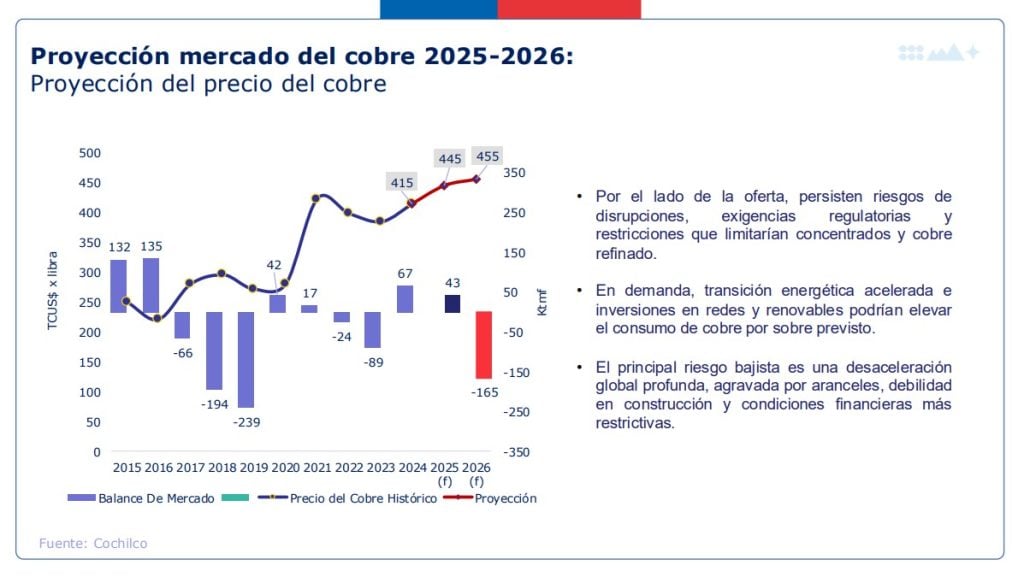 Este cuadro refuerza la lectura de Cochilco: la demanda seguirá empujando fuerte en los próximos años, mientras la oferta crece con más lentitud, tensionando aún más el mercado y respaldando la proyección de un precio promedio del cobre históricamente alto.