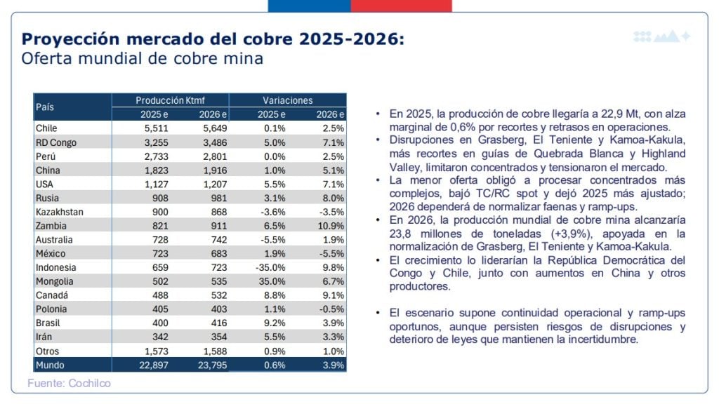 En materia de producción, Cochilco proyecta que la producción mundial de cobre mina alcance los 22,9 millones de toneladas en 2025, para luego subir a 23,8 millones de toneladas en 2026, lo que implica un crecimiento cercano al 3,9% interanual.